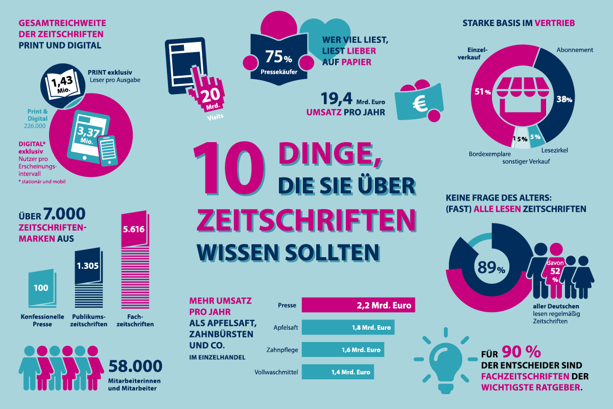 Deutschland hat mit 350 Verlagen im Medienverband der freien Presse und branchenweit über 7.000 Marken und tausenden Webseiten eine der vielfältigsten Zeitschriftenlandschaften weltweit. Mehr als 9.000 Journalistinnen und Journalisten arbeiten bei diesen Marken. Die 5.616 Fachzeitschriften, 1.305 Publikumszeitschriften und 100 Titel der konfessionellen Presse bieten den Leserinnen und Lesern Informationen, Fachwissen, Orientierung und Unterhaltung in breiter Themenvielfalt. Mit jeder Ausgabe erreichen die Print- und Digitalangebote der Zeitschriftenverlage über 5 Millionen Leserinnen und Leser. Vor allem im digitalen Bereich steigt die Nutzung: 20 Milliarden Visits verzeichneten die Zeitschriftenmarken 2021 , fast drei Milliarden Visits mehr als noch 2019. Trotz der Möglichkeit, Magazinmarken digital zu konsumieren, bevorzugen 75 Prozent der Leserschaft das gedruckte Format. Vor allem längere Artikel werden laut der Käufermarktstudie des MVFP lieber auf Papier gelesen.