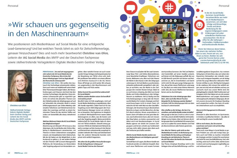 Eine Chance ist auf jeden Fall die Lead-Generierung! Neue Print- und Online-Abonnentinnen, neue Newsletter-Empfänger, Teilnehmer vonEvents, Webinaren usw. Aber auch die Präsenz der Marke in dem Kanal, in dem die Zielgruppe unterwegs ist. Sich als Marke zu positionieren, entweder professionell, sympathisch oder nahbar, je nachdem, was der Marke in der Zielgruppe den meisten Nutzen bringt. Dabei ist es noch immer schwierig, den Wert von Social Media und Online-Marketing in den Verlagshäusern zu etablieren. Viel zu häufig sind die Entscheidungswege zu lang oder die Verantwortlichkeiten für Content, Strategie und Zielerreichung liegen nicht in einem Team. Ich wünsche mir hier mehr Mut von den Geschäftsleitungen, die Verantwortung in die einzelnen Bereiche zu legen und die Menschen, die täglich damit arbeiten, Neues ausprobieren zu lassen. Denn oft haben wir eine gute Idee davon, was funktionieren kann, aber wir müssen das Okay haben, zu testen, auszuwerten und dabei auch mal danebenzuliegen. In Social Media agieren wir direkt mit unseren Zielgruppen und lernen schnell, was funktioniert und was nicht, dafür müssen aber eben auch die Freiräume geschaffen werden.