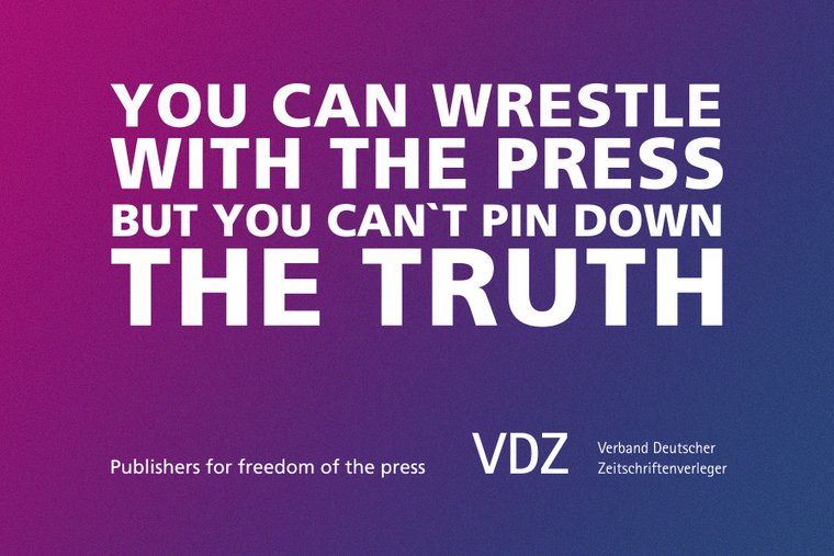 Die deutschen Zeitschriftenverleger setzen ihre Pressefreiheitskampagne mit neuen Aktionen fort. Unter dem Motto „You can wrestle with the press, but you can't pin down the truth” adressieren sie an die Regierungschefs des G20-Gipfels. In immer mehr Ländern wird laut der aktuellen Weltkarte der Pressefreiheit von Reporter ohne Grenzen aus gelebter Pressefreiheit, Unterdrückung der Meinungsfreiheit bis hin zu lebensbedrohender Repression.