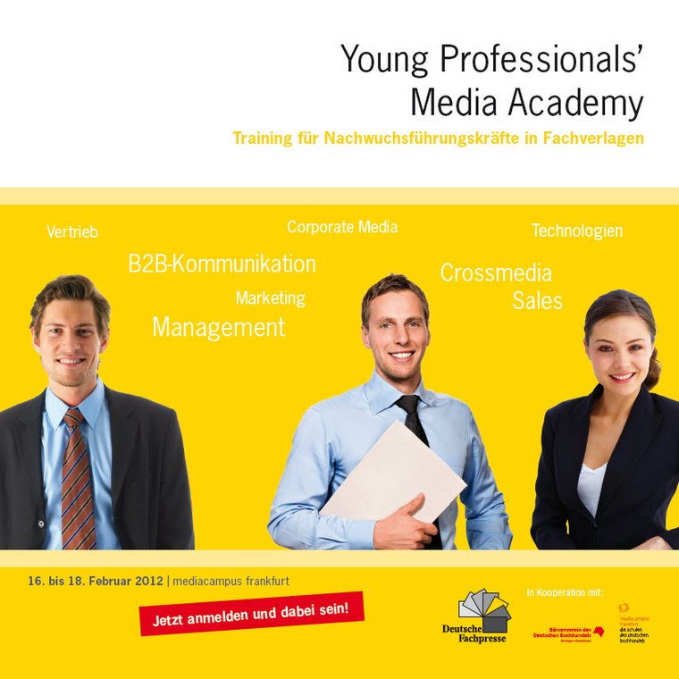Mehr als 20 Branchen- und Medienexperten wie Paul Kho (KUKA Roboter), Sebastian Woerle (IDG) und Dr. Sven Fund (De Gruyter) live erleben, berufliche Erfahrungen miteinander teilen und persönliche Netzwerke für heute und morgen aufbauen: Die Young Professionals‘ Media Academy der Deutschen Fachpresse vom 16. bis 18. Februar 2012 macht‘s möglich und bringt junge Fachkräfte in Verlagen fachmedienspezifisch auf den neuesten Wissensstand. Wer dabei sein will, kann sich noch bis zum 19. Januar anmelden. Mehr Informationen rund um die Teilnahme und das vollständige Programm hier.