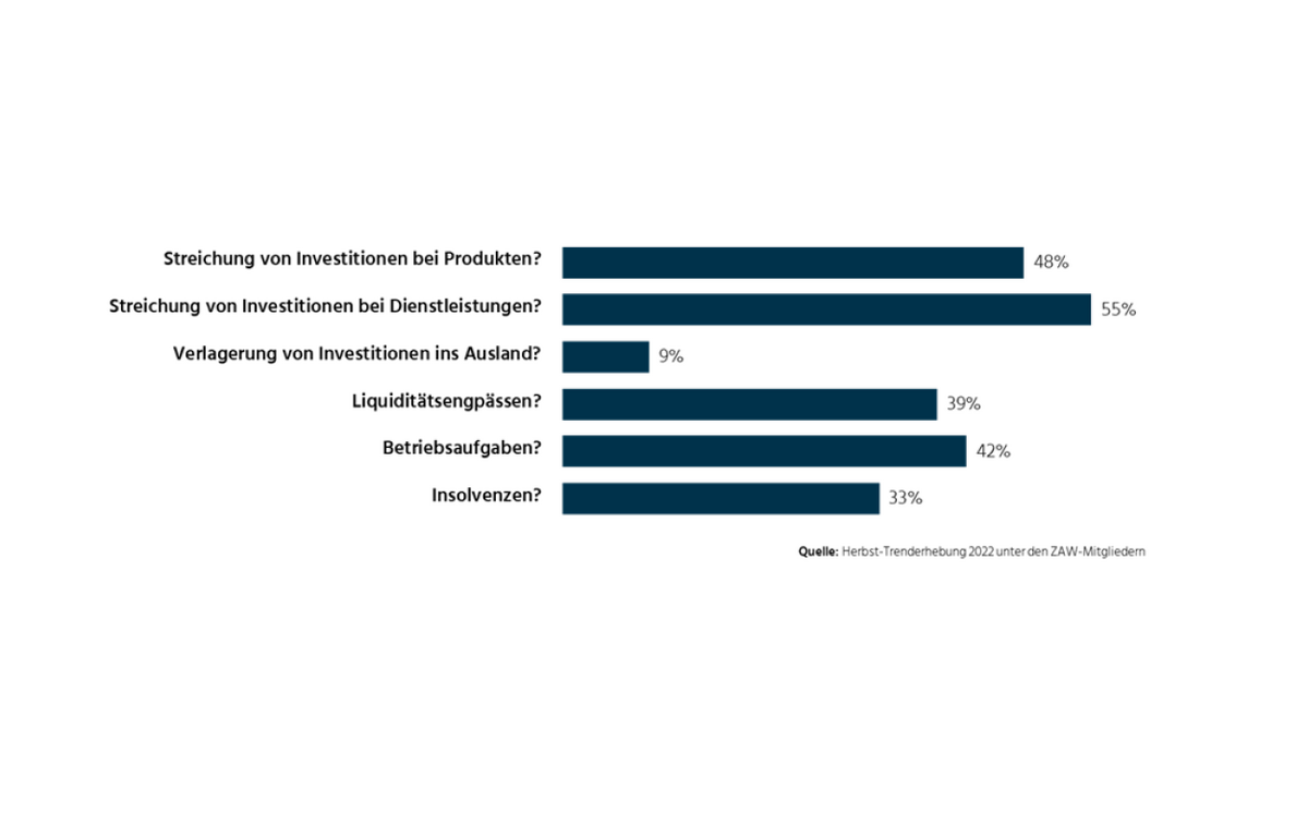 Rezessive Konjunkturdaten, Inflation und sinkende Konsumlaune belasten die ZAW-Mitglieder: Mit Blick auf das zu Ende gehende Jahr und das erste Quartal 2023 befürchten 48 Prozent Streichungen von Investitionen bei Produkten, 55 Prozent bei Dienstleistungen, nur 9 Prozent sehen Investitionsverlagerungen ins Ausland. Liquiditätsengpässe befürchten weiterhin 39 Prozent, 42 Prozent gehen von Betriebsaufgaben aus und 33 Prozent gar von Insolvenzen.