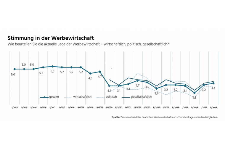 Das aktuelle Trendbarometer des Zentralverbands der Deutschen Werbewirtschaft, erhoben Ende Oktober 2025, zeigt eine nur geringfügige Verbesserung der Branchenstimmung. Zwar steigt der Gesamtwert im Vergleich zum Frühjahr von 3,2 auf 3,4 Punkte, doch bleibt das Bild insgesamt – und in der Gesamtschau der letzten 10 Jahre (siehe Grafik) – weiterhin sehr verhalten. Vor allem politisch ist kein durchgreifender Aufschwung erkennbar: Während sich im Frühjahr nach einem historischen Tiefpunkt die Bewertung der politischen Rahmenbedingungen deutlich erholte (von 1,8 Ende 2024 auf 3,0 im Frühjahr 2025), verharrt die Stimmung nun bei 3,0 Punkten. Entsprechend ist eine Verbesserung der wirtschaftspolitischen Rahmenbedingungen in den letzten Monaten aus Sicht der ZAW-Mitglieder kaum erkennbar.