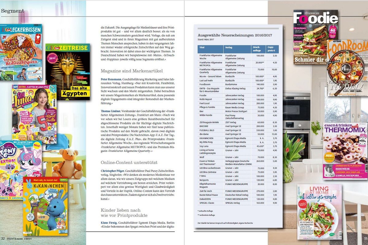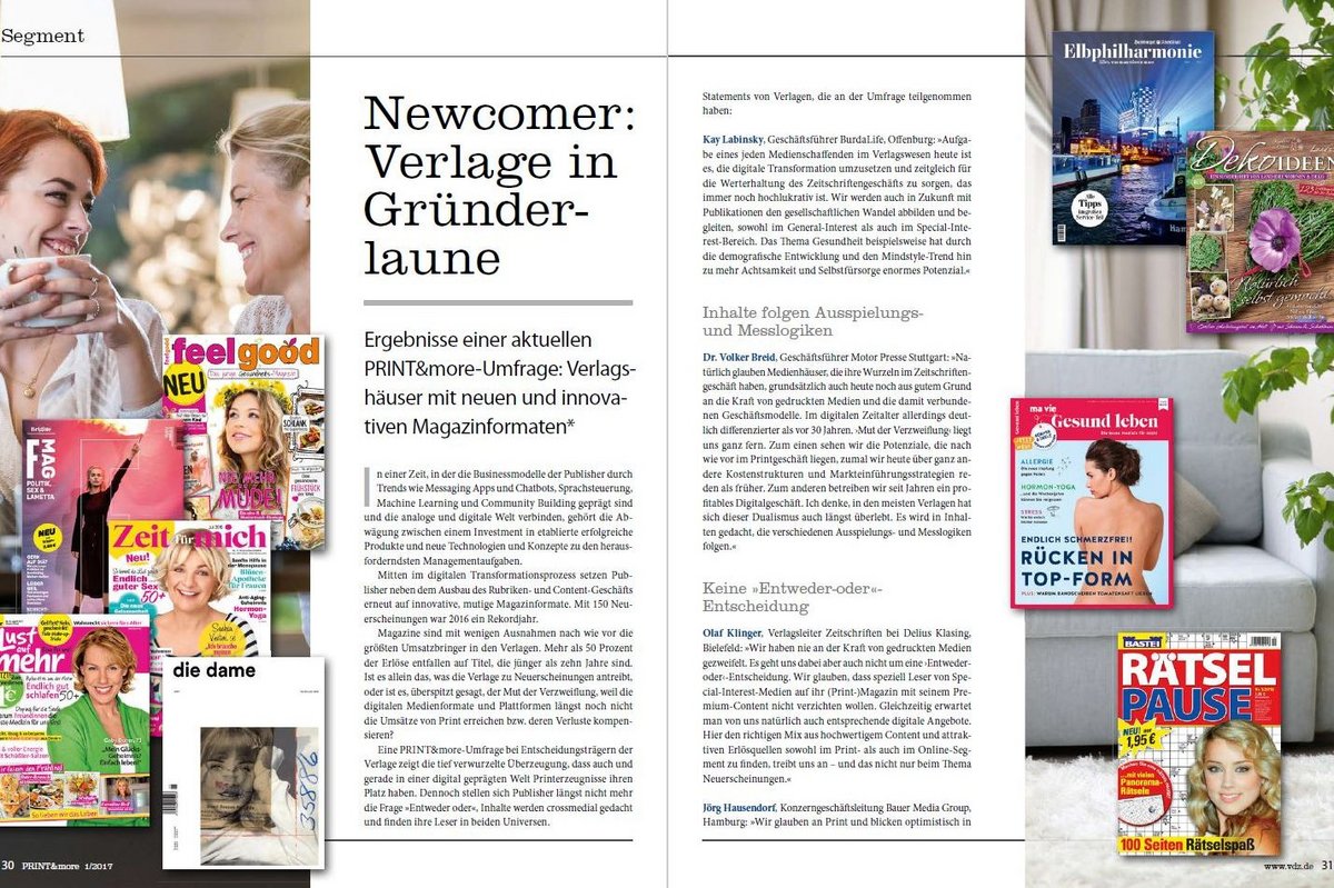 Neben dem starken Einsatz für Pressefreiheit untermauern die Verlage ihre Innovationsfähigkeit. Die Ergebnisse der neuen PRINT&more-Umfrage beweisen es: Die Verlage sind in Gründerlaune. Mit neuen Titeln zeigen sie, dass auch und gerade in einer digital geprägten Welt Printerzeugnisse ihren Platz haben. Innovative und mutige Magazinformate, die sich bewusst vom schnellen Informationskonsum abheben, verleihen Printprodukten weiterhin Hochwertigkeit und Glanz. Lesen Sie in den über 30 Meldungen aus den Verlagshäusern und im großen Segmenttitel: "Newcomer: Verlage in Gründerlaune" alle wichtigen Zahlen, Fakten und Statements nach.