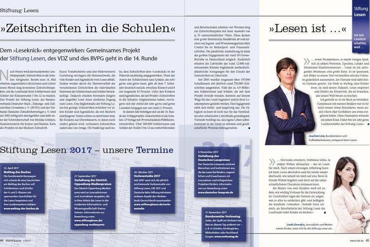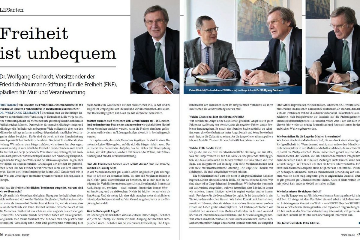 Der VDZ positioniert sich mit der Kampagne "Pressevielfalt schützt Deine Meinungsfreiheit". Das Cover dieser Ausgabe zeigt das ab sofort verfügbare, neue Anzeigenmotiv. Die Kampagne rund um journalistische Wahrhaftigkeit und Mut zielt dieses Jahr noch stärker auf junge Menschen ab, um gerade Schüler und Studenten für die Relevanz des Themas zu sensibilisieren. Informationen zu geplanten Veranstaltungen, sowie ein Interview mit dem Vorsitzenden der Friedrich-Naumann-Stiftung Dr. Wolfgang Gerhardt über die Freiheit in Deutschland finden Sie in der PRINT&more.