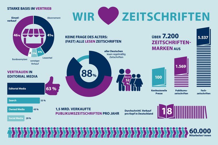 Regelmäßig lesen 88 Prozent aller Deutschen ab 14 Jahren Zeitschriften (B4P 2019-2). Sowohl Frauen als auch Männer gleichermaßen. Allein in der Gattung der Publikumszeitschriften liegt der durchschnittliche Verkauf pro Kopf in Deutschland bei 18 Heften. Im Jahr 2019 wurden insgesamt 1,5 Milliarden Publikumszeitschriften verkauft, belegen die Auswertungen der Informationsgemeinschaft zur Feststellung der Verbreitung von Werbeträgern e. V. (IVW). Der Großteil der Zeitschriften wird im Einzelverkauf vertrieben (46 Prozent) – beispielsweise am Kiosk, im Lebensmittelhandel sowie an Bahn- oder Flughäfen – dicht gefolgt vom Abonnement: 41 Prozent der Zeitschriften erhalten die Leserinnen und Leser direkt zu sich nach Hause oder an den Arbeitsplatz (IVW 2019-4). Zeitschriften genießen das Vertrauen der Leserschaft. Editorial Media liegen im 2020 Edelmann Trust Barometer mit 63 Prozent weit vor Sozialen Medien, den nur 29 Prozent der Befragten vertrauen.