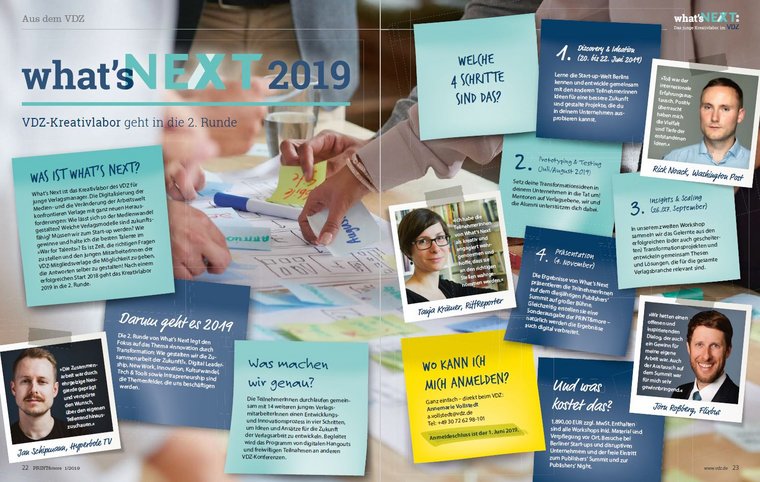 PRINT&more zeigt im neuen Heft einen Ausblick auf die zweite Runde des erfolgreichen VDZ Kreativlabors „What’s Next“, in dem junge Verlagsmitarbeiterinnen und -mitarbeiter die Möglichkeit haben, Antworten auf die drängenden Fragen des Medienwandels selbst aktiv zu entwickeln. Der Fokus liegt dabei auf dem Thema „Innovation durch Transformation: Wie gestalten wir die Zusammenarbeit der Zukunft?“