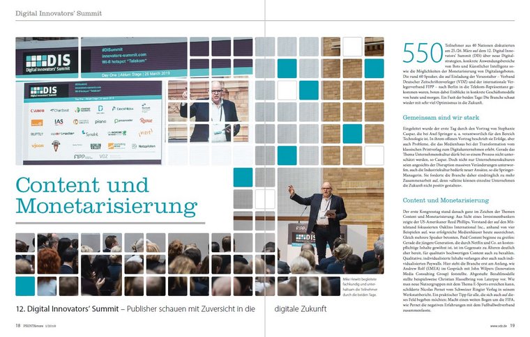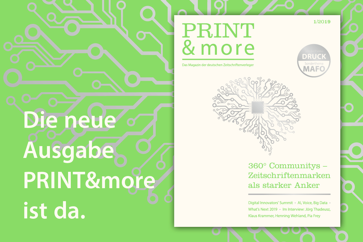 Die erste PRINT&more des Jahres ist da! Die neue Ausgabe fokussiert auf 56 Seiten innovative und moderne Ideen der Zeitschriftenbranche, und blickt dazu auch zurück auf die erfolgreichen Strategien und globalen Trends des zwölften Digital Innovators‘ Summit. Mit 60 internationalen, hochkarätigen Speakern und 550 Teilnehmern aus 40 Nationen trafen sich Ende März Experten der internationalen Medienbranche und diskutierten über neue Digitalstrategien, konkrete Anwendungsbereiche von Bots und Künstlicher Intelligenz sowie die Möglichkeiten der Monetarisierung. Ein Fazit der beiden Tage: Die Branche schaut mit viel Optimismus in die Zukunft.
