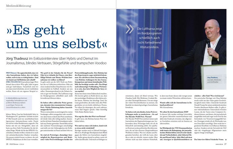 Im exklusiven Interview mit Jörg Thadeusz spricht der Journalist, Moderator und Schriftsteller über Hybris und Demut im Journalismus, blindes Vertrauen, Störgefühle und trumpschen Voodoo. Der Sprecher der Deutschen Fachpresse Dr. Klaus Krammer erklärt zum einen den „Preiswert des ‚Fachjournalisten des Jahres‘“ und zum anderen das Zusammenspiel von Fachmedienhäusern und Mediaagenturen. In der Rubrik „Am Kiosk“ erklärt der Journalist und Medienunternehmer Oliver Wurm, der das Grundgesetz zum 70. Jubiläum als Magazin an den Kiosk brachte, warum er beim „PRINT&more-Magazin-Date“ am Bahnhofskiosk spontan zu „JWD“ griff – und ob er es wieder machen würde.