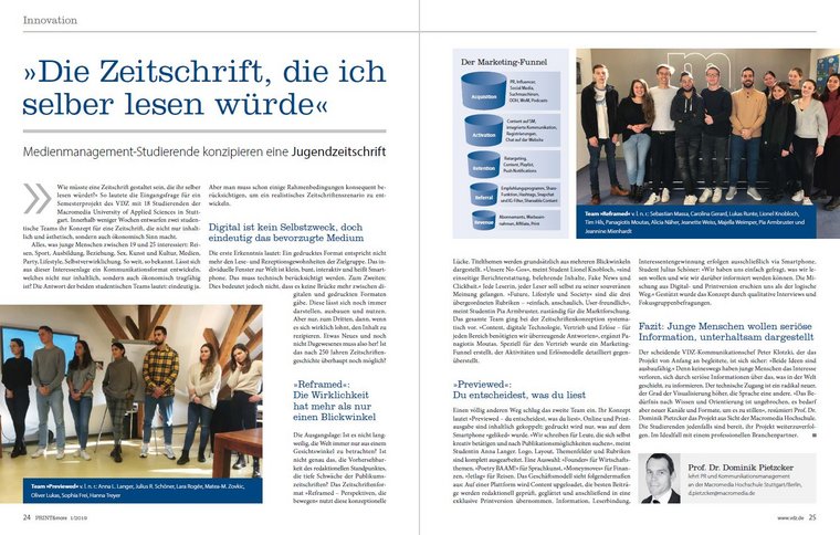In eine ähnliche Richtung geht auch das Semesterprojekt von Medienmanagement-Studierenden der Macromedia-Hochschule, die für PRINT&more eine Zeitschrift konzipierten, die sie als Zielgruppe zwischen 19 und 25 Jahren selbst lesen würde. Der technische Zugang ist ein neuer, der Grad der Visualisierung höher, die Sprache eine andere. Aber dennoch wollen auch junge Menschen sich durch seriöse Quellen über das, was in der Welt geschieht, informieren.