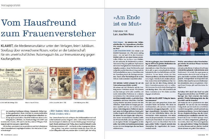 Verleger Lars Joachim Rose gewährt für das Verlagsportrait der Mediengruppe Klambt Blicke in sein journalistisches „Gewächshaus“, welcher Titel wie „Jolie“, „OK!“ oder „Grazia“ entspringen. Das zweite Porträt stellt den Wort & Bild Verlag vor, der in Sachen Gesundheit auf leicht verständlichen Fachjournalismus setzt. CEO Andreas Arntzen spricht im exklusiven Interview über seine Erfolgsfaktoren und Zukunftsaussichten. Perspektiven ihrer Verlagshäuser zeigen in weiteren Interviews Matthias Bauer, Vogel Communications Group, Viktoria Bittmann, politik&kommunikation, Nils Oberschelp, Motor Presse Stuttgart, und Peter Turi, turi2. Während FDP MdB Gyde Jensen über den Wert von Journalismus und ihren Umgang mit den sozialen Medien spricht, fesselt der „Reemtsma Liberty Award“-Preisträger Michael Obert in einem Interview über seine Arbeit.