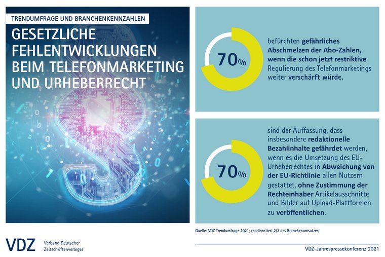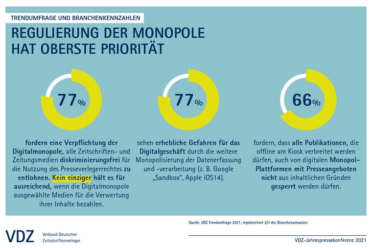 Die diesjährige VDZ-Trendumfrage verdeutlich die großen Sorgen über die Marktdominanz der Digitalkonzerne sowie die Bedenken vor wirtschaftsfeindlichen Regulierungsschritten, die die Refinanzierung journalistischer Angebote gefährden. Mehr als drei Viertel der teilnehmenden Zeitschriftenverlage fordern eine Verpflichtung der Digitalmonopole, alle Zeitschriften- und Zeitungsmedien diskriminierungsfrei für die Nutzung des Presseverlegerrechts zu entlohnen, niemand hält es für ausreichend, wenn die Digitalmonopole nur ausgewählte Medien für die Verwertung ihrer Inhalte bezahlen. Ebenfalls fast 80 Prozent sehen erhebliche Gefahren für das Digitalgeschäft durch die weitere Monopolisierung der Datenerfassung und -verarbeitung, wie es bspw. Google mit der sogenannten „Sandbox“ oder Apple mit der Einführung von iOS14 planen. Darüber hinaus befürchten 70 Prozent ein gefährliches Abschmelzen der Abo-Zahlen, wenn die schon jetzt sehr restriktive Regulierung des Telefonmarketings weiter verschärft werden würde. 70 Prozent sind der Auffassung, dass insbesondere redaktionelle Bezahlinhalte gefährdet werden, wenn es die Umsetzung des EU-Urheberrechtes in Abweichung von der EU-Richtlinie allen Nutzern gestattet, ohne Zustimmung der Rechteinhaber Artikelausschnitte und Bilder auf Upload-Plattformen zu veröffentlichen. Auch die redaktionelle Freiheit hängt zunehmend von digitalen Torwächtern ab, über deren Plattformen wachsende Leseranteile Presse konsumieren: Zwei Drittel der Verlage sind der Ansicht, dass alle Publikationen, die offline am Kiosk verbreitet werden dürfen, auch von digitalen Monopolplattformen mit Presseangeboten nicht aus inhaltlichen Gründen gesperrt werden dürfen. Diese Verlage lehnen es ab, dass digitale Torwächter nach eigenem Gutdünken über die Freiheit des Pressevertriebs entscheiden.