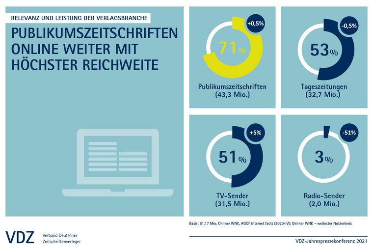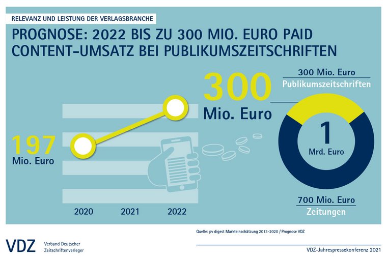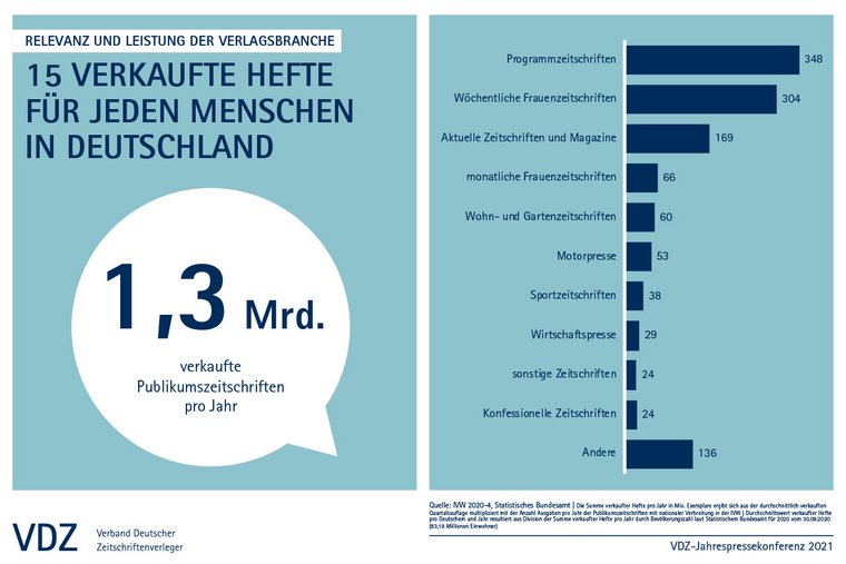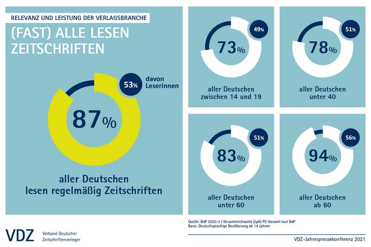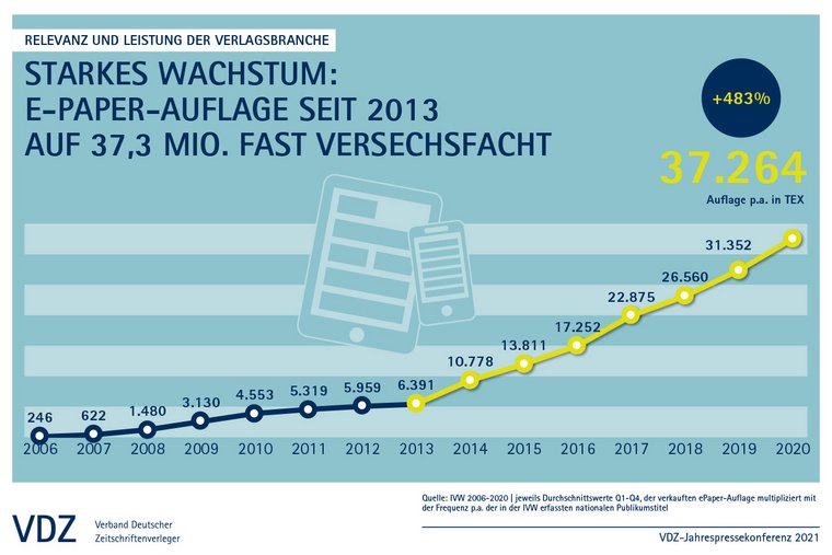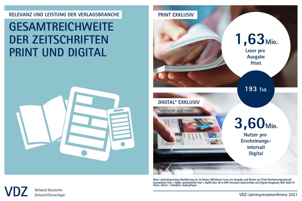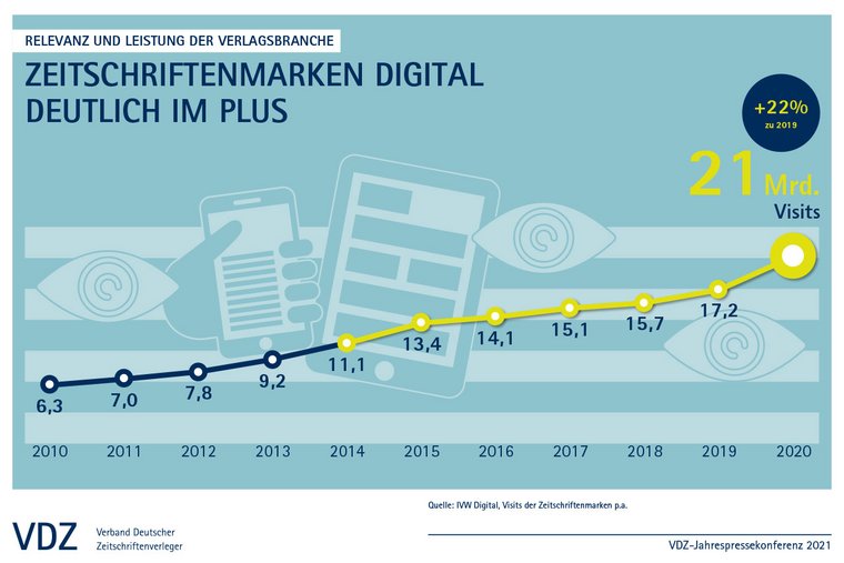 „Die Corona-Krise legt die Sollbruchstellen in Politik, Gesellschaft und Wirtschaft offen. Es wurde im Corona-Jahr deutlich, dass die 360°-Versorgung der Lesermärkte über alle Verbreitungswege und die breit gefächerten Print- und Digitalmodelle der Zeitschriftenmedien zur Refinanzierung der Inhalte und Services funktionieren“, erklärt VDZ-Hauptgeschäftsführer Stephan Scherzer in Berlin. „Die Zeitschriftenmedien haben die Chancen der Transformation genutzt und verzeichnen digital erhebliche Reichweiten- und Erlöszuwächse, sowie gewachsenes Vertrauen in die Informationsqualität der journalistischen Angebote. Um die Erfolge in der Transformation nicht zu gefährden, fordern wir von der Politik ein Belastungsmoratorium für die gedruckte und digitale Presse.“ Den Paid Content-Umsatz mit E-Papern und Paywall-Modellen konnten die Publikumsmedien um 44 Prozent auf rund 200 Millionen Euro steigern. Die E-Paper-Auflage der Publikumstitel ist innerhalb eines Jahres von 31,4 Mio. auf 37,3 Mio. Ausgaben sowie die Zahl der Visits von 17,2 Mrd. auf 21 Mrd. gestiegen.