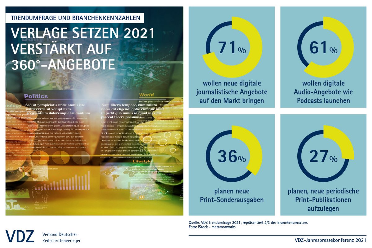 In Bezug auf die Geschäftserwartungen für 2021 sind die Zeitschriftenverleger der VDZ-Trendumfrage zufolge verhalten optimistisch. Umsatzsteigerungen bei Paid Content (+38 Prozent), im digitalen Werbegeschäft (+13 Prozent), im Digital-Vertrieb (+19 Prozent) und Brand Business (+ 32 Prozent) sowie bei Veranstaltungen (+ 52 Prozent) stehen erwartete Umsatzrückgänge im Print-Werbegeschäft von -7,5 Prozent und -3,8 Prozent im Print-Vertrieb gegenüber. Um zusätzliche Umsatzpotenziale zu heben, planen 71 Prozent, neue journalistische Digital-Angebote einzuführen, 61 Prozent neue Audio-Angebote. Auch in neue Print-Produkte werden die Medienhäuser investieren. Demnach wollen 36 Prozent neue Print-Sonderausgaben und 27 Prozent neue periodische Printtitel launchen.
