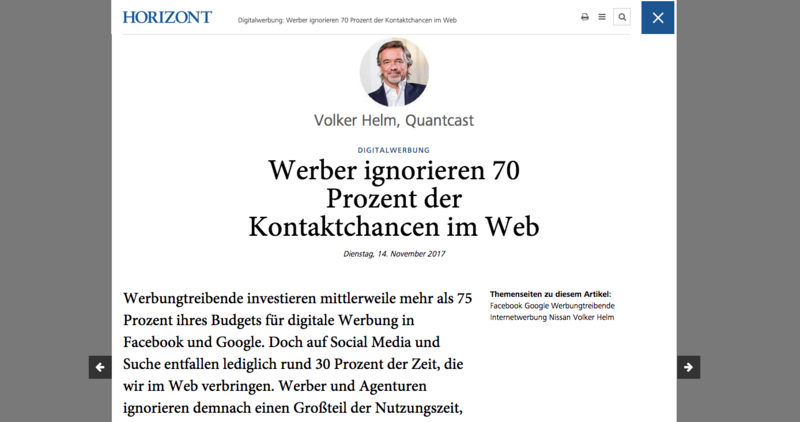 Für mehr digitale Werbung außerhalb der "walled gardens" von Facebook und Google plädiert Volker Helm, Managing Director DACH & Nordics bei Quantcast…