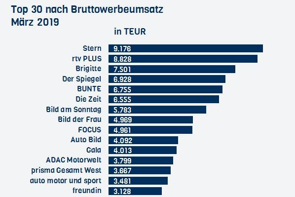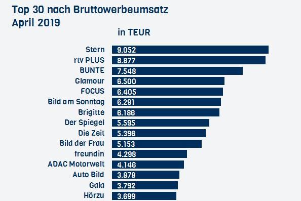 Der Stern behauptet im April mit rund 9,1 Millionen Euro die Spitze des Umsatzrankings vor rtv Plus mit 8,9 Millionen Euro. (Grafik unten).Bunte…