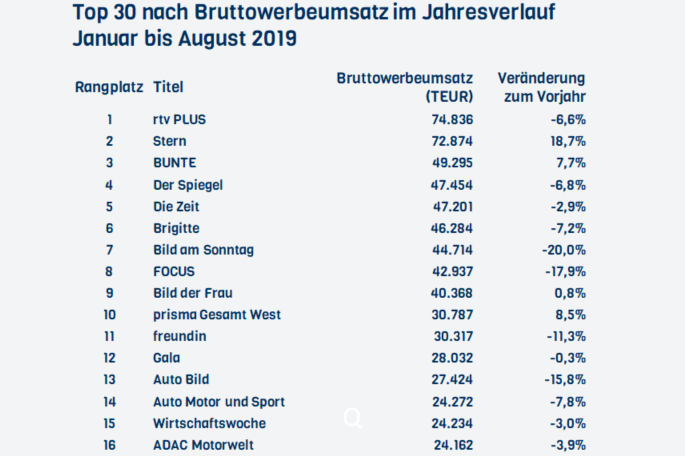 Im bisherigen Jahresverlauf, also von Januar bis August, liegt der Stern unter den am Kiosk erhältlichen Zeitschriften mit einem Bruttowerbeumsatz von…