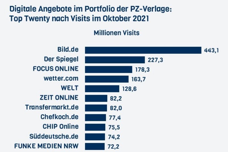Das Ranking der meistbesuchten digitalen Verlagsangebote wird im Oktober mit rund 443 Millionen Visits von Bild.de angeführt (Grafik unten). Der…