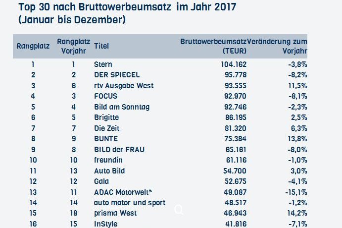 Der Stern verteidigt 2017 seine Spitzenposition beim Bruttoanzeigenumsatz. Er baut mit einem Umsatz von rund 104 Millionen Euro den Vorsprung vor dem…