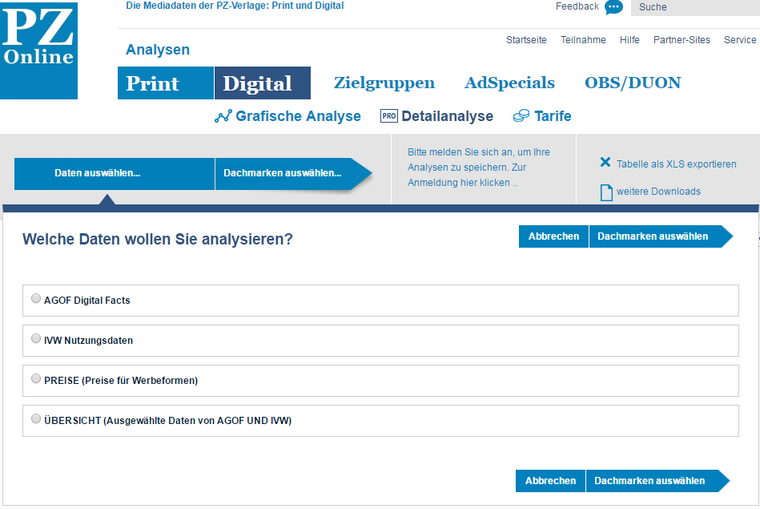 Seit 20 Jahren ist www.pz-online.de das umfassende VDZ-Portal zur Analyse der Mediadaten von Print- und Online-Angeboten der PZ-Verlage. In einer zentralen Datenbank werden täglich Mediadaten aus unterschiedlichen Quellen (IVW, MA, Nielsen, AGOF, etc.) zusammengeführt. Nutzer des Portals können diese Daten in grafischer und tabellarischer Form darstellen, analysieren und für hauseigene Systeme exportieren.