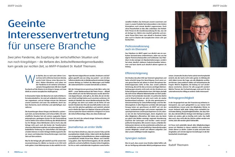 Mit dieser neuen Ausgabe der relaunchten PRINT&more schlägt der MVFP nicht nur eine neue Optik und ein neues Design seines Verbandsmagazins auf, sondern ein neues Kapitel der Interessenvertretung der Zeitschriftenbranche. Der VDZ ist Vergangenheit, seit April agiert der Medienverband der freien Presse als „geeinte Interessenvertretung für unsere Branche“ – so beschreibt es MVFP-PräsidentDr. Rudolf Thiemann in seinem Gastbeitrag in dieser ersten MVFP-Ausgabe. Zwei Jahre Pandemie, eine Zuspitzung der wirtschaftlichen Situation und nun noch Kriegsfolgen, die auch überall dort zu spüren sind, wo keine Bomben und Schüsse fallen – der mehrjährige Reformprozess des Verbandes sei zur richtigen Zeit abgeschlossen worden, so Thiemann. Europa und die demokratische Welt stehen vor enormen Herausforderungen – militärisch, wirtschaftlich, aber auch gesellschaftlich.