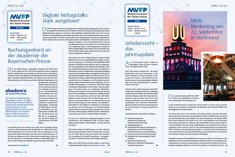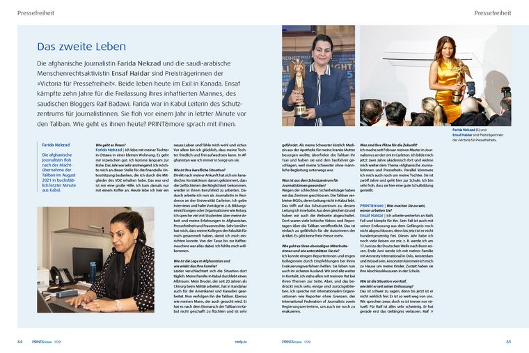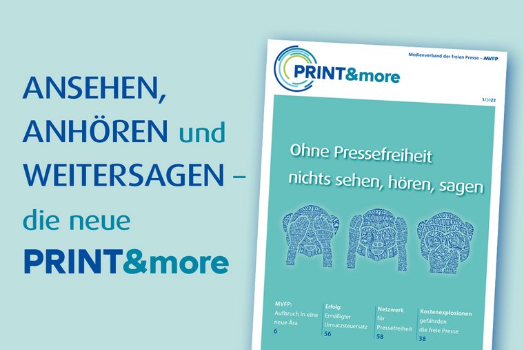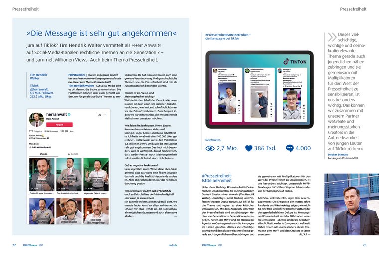 Wenn Panzer rollen, Grundrechte unter die Ketten geraten, Wahrheit dem Populismus oder der Propaganda zum Opfer fällt, ist jeder Einzelne umso mehr gefordert, sich den Widersachern der Pressefreiheit entgegenzustellen. Die neuen, plakativen Motive der MVFP-Pressefreiheitskampagne sollen Menschen noch mehr dazu bewegen, bei der persönlichen Information näher hinzuschauen. Dafür steht auch das druckveredelte Cover dieses Hefts. Denn auch die Haptik ist Teil des Ganzen. Der schillernde Titel „Ohne Pressefreiheit nichts sehen, hören, sagen“ lädt zum Fühlen ein. Auf 16 Seiten liefert die neue PRINT&more einen ausführlichen Rückblick auf die aktionsreiche Themenwoche des MVFP mit seinen elf Partnern zum Tag der Pressefreiheit. Was es bedeutet, in Ländern zu leben, die eine freie Presse verhindern, berichten die Preisträgerinnen der „Victoria für Pressefreiheit“ Farida Nekzad und Ensaf Haidar. Sie setzen sich seit Jahren unerschrocken für eine freie Presse in Afghanistan und in Saudi-Arabien ein. In exklusiven Interviews berichtenTobias Wolf, Journalist „Freie Presse“, und Dr. Maren Jasper-Winter, Mitglied im Vorstand der Friedrich-Naumann-Stiftung für die Freiheit, Mitglied im Bundesvorstand der FDP, sowieTim Hendrik Walter (erfolgreicher TikToker als „Herr Anwalt"), welche Bedeutung Pressefreiheit für sie hat.