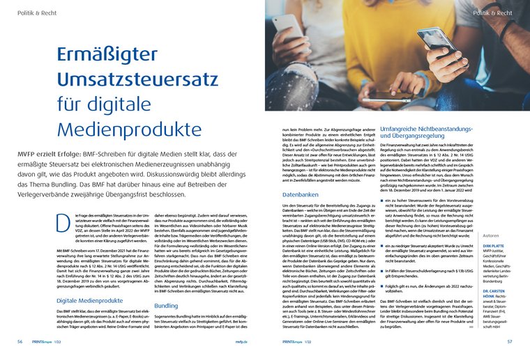 Über Neuerungen beim ermäßigten Umsatzsteuersatz für digitale Medienprodukte berichten Dr. Carsten Höink und Dirk Platte.