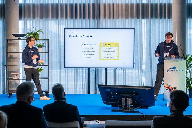 Daran anknüpfend demonstrierten Simeon Räthel, CEO & Co-Founder, Frederick Jahn, CTO & Co-Founder von Centinel Analytica, wie technisch ausgefeilt moderne KI-Crawler mittlerweile agieren und warum klassische Schutzmechanismen nicht mehr ausreichen. Neben sichtbaren Bots kämen zunehmend sogenannte Stealth-Crawler zum Einsatz, die sich über maskierte IP-Strukturen, Headless-Browser und rotierende Proxy-Netzwerke als menschliche Nutzer tarnen. „Robots.txt ist nur ein Signal – aber kein Schutzwall“, erklärte Räthel. „Was wir brauchen, ist ein echter „Enforcement Layer“, der erkennt, wer auf Inhalte zugreift, zu welchem Zweck, und der diesen Zugriff vor allem technisch kontrollierbar macht.“ Moderne Bot-Protection-Systeme arbeiteten mit mehrschichtigen Identitätsprofilen, um auch schwer erkennbare KI-Agenten zu identifizieren. Erst auf dieser Grundlage könne entschieden werden, welche Inhalte blockiert, welche freigegeben und welche perspektivisch monetarisiert würden. Räthel und Jahn betonten, dass Schutzmaßnahmen kein Selbstzweck seien, sondern Voraussetzung für neue Geschäftsmodelle: „Es muss für den Angreifer teurer sein, die Schutzmauern der Publisher zu umgehen, als regulär an die Tür zu klopfen und für Inhalte zu bezahlen“, so Jahn.