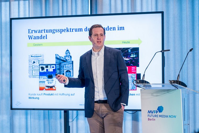 Dennis Hirthammer, CCO und stellvertretender Geschäftsführer der Vogel Communications Group (VCG), richtete den Blick auf die Veränderungen im Content-Geschäft: Fachmedien bleiben relevant. Jedoch haben sich die Nutzungsformen diversifiziert und verteilen sich auf immer mehr Kanäle. Anhand der VCG-Transformationsgeschichte demonstrierte Hirthammer den 120 Gästen vor Ort und im Livestream, wie B2B-Content in einer fragmentierten, datengetriebenen Welt Wirkung entfaltet, wenn Medienhäuser konsequent „vom Kunden rückwärts“ denken: „Der Kunde kauft heute kein Produkt mehr, sondern ein Leistungsversprechen. Wir müssen zuerst sein Problem verstehen – und dann gemeinsam mit ihm die Lösung entwickeln.“