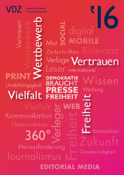 Das Kompendium ‚VDZ 2016‘ ist ein Autorenbuch, das in den Kapiteln "Freiheit", "Vielfalt", "Vertrauen" und "Wettbewerb" eindrucksvoll aufzeigt, wie innovativ, kreativ und lebendig die Zeitschriftenbranche ist. Die deutschen Verlage sind mit Print, Web und Mobile sehr präsent und erfolgreich. Editorial Media, die journalistischen Inhalte der Verlage, wirkt auf allen Kanälen.