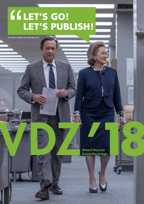 Das VDZ Branchenkompedium VDZ’18 zeigt in vier Kapiteln, wie vielseitig, kreativ und wandlungsfähig die Zeitschriftenbranche ist. „Investieren, Mut haben, ein Ziel verfolgen und nach bestimmten Werten richten“ - VDZ-Präsident Dr. Rudolf Thiemann formuliert den Kurs der Branche, wenn es darum geht, Erfolg und Wertebewusstsein der Sparte zu pflegen und sich in den Dienst eines schweren Umbruchs zu stellen. Das Cover des Buchs greift diesen Umbruch auf: Darauf zu sehen ist Meryl Streep in ihrer Rolle der Kay Graham in „Die Verlegerin“– eine Frau, die neu dachte und Veränderung brachte.